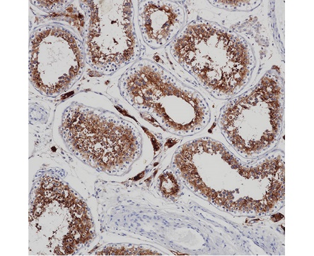 Immunohistochemistry of formalin fixed paraffin embedded human testis using BeyoIHC™ ACE2 monoclonal antibody at dilution of 1:200.