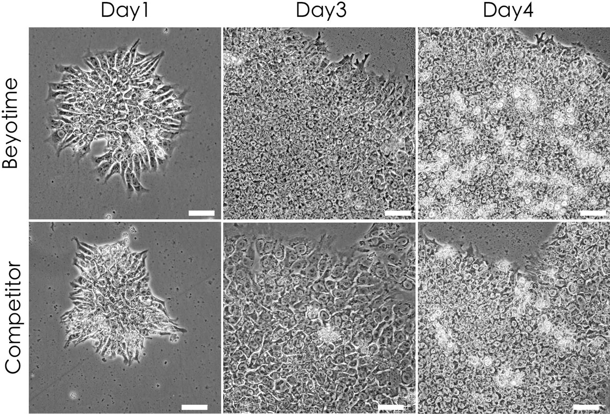 图1.碧云天BeyoEmbryo™ Human Vitronectin (C0319)用于培养H9人胚胎干细胞的细胞形态和生长状态效果图。使用本产品或T公司(Competitor)的Recombinant Human Vitronectin (3μg/cm2铺板)培养H9人胚胎干细胞,并观察细胞形态和生长状况。如图所示,本产品与T公司的产品相比,具有类似维持和促进H9人胚胎干细胞生长的效果。Scale Bar均为50µm。实际检测效果会因细胞、检测仪器和实验条件的不同而存在差异,本图仅供参考。