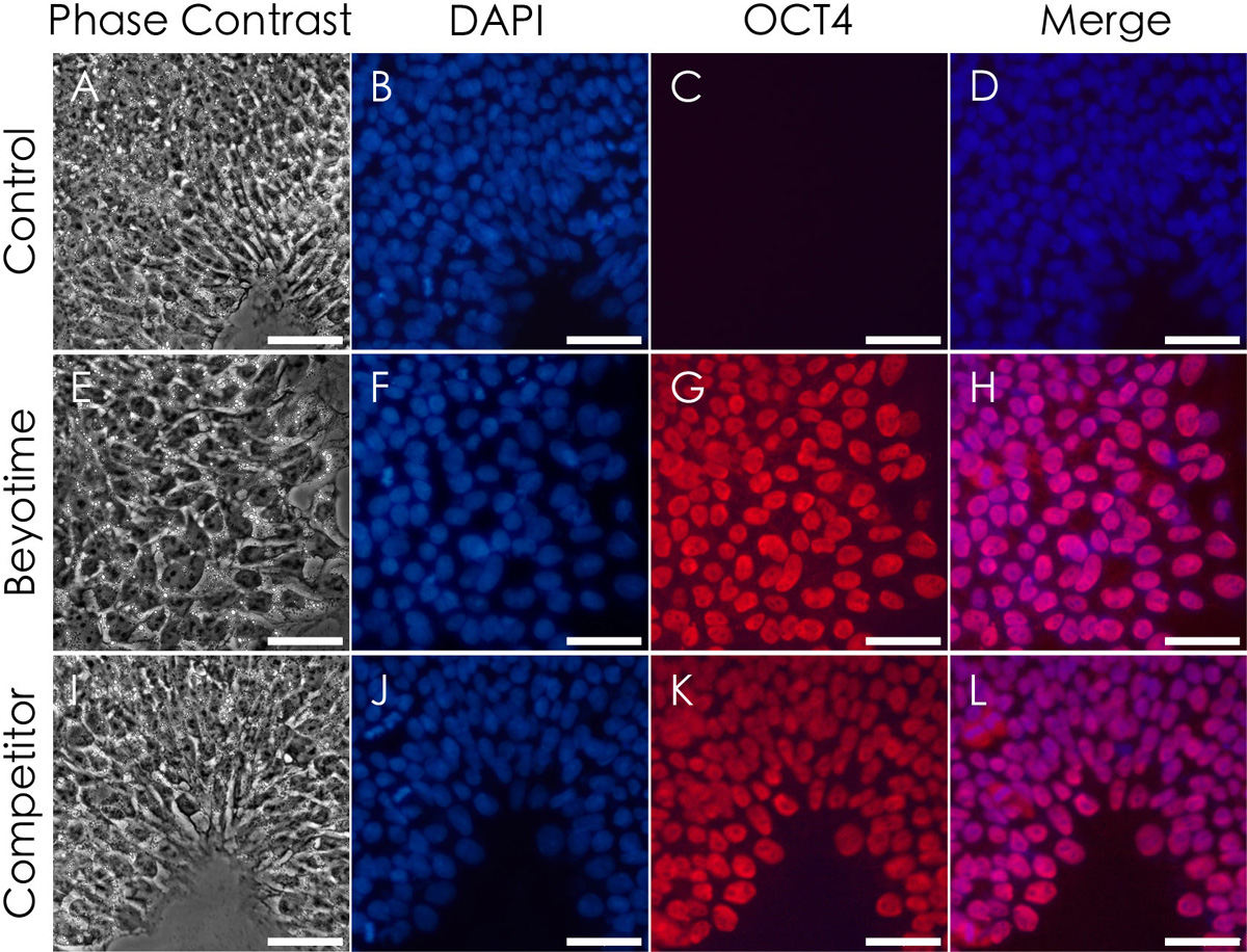 图2.碧云天BeyoEmbryo™ Human Vitronectin (C0319)培养H9人胚胎干细胞的干性维持效果使用OCT4抗体和SOX2抗体进行免疫荧光染色的效果图。使用本产品或Competitor T的Recombinant Human Vitronectin (3μg/cm2铺板)培养H9人胚胎干细胞,并使用碧云天生产的C3261 多能干细胞免疫荧光检测试剂盒(Oct4, 红色荧光)和C3266 多能干细胞免疫荧光检测试剂盒(Sox2, 红色荧光)进行免疫荧光染色检测。图A、E、I为明场下H9人胚胎干细胞形态图,图B、F、J为DAPI染色效果图,图C、G、K为OCT4 (左图)和SOX2 (右图)免疫荧光染色效果图,图D、H、L为叠加效果图。如图所示,与阴性对照(Control)相比,BeyoEmbryo™ Human Vitronectin能够显著促进H9人胚胎干细胞的生长和干性维持。本产品与Competitor T相比,具有类似维持和促进H9人胚胎干细胞生长和干性维持的效果。Scale Bar均为50µm。实际检测效果会因细胞、检测仪器和实验条件的不同而存在差异,本图仅供参考。