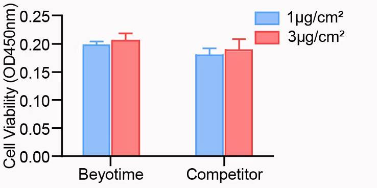 图4.碧云天BeyoEmbryo™ Human Vitronectin (C0319)培养H9人胚胎干细胞的细胞活力检测效果图。使用本产品或T公司(Competitor)的Recombinant Human Vitronectin (1或3μg/cm2铺板)培养H9人胚胎干细胞,并使用CCK-8 (C0037)检测细胞活力。如图所示,本产品与T公司的产品相比,具有类似维持和促进H9人胚胎干细胞生长的效果。实际检测效果会因细胞、检测仪器和实验条件的不同而存在差异,本图仅供参考。