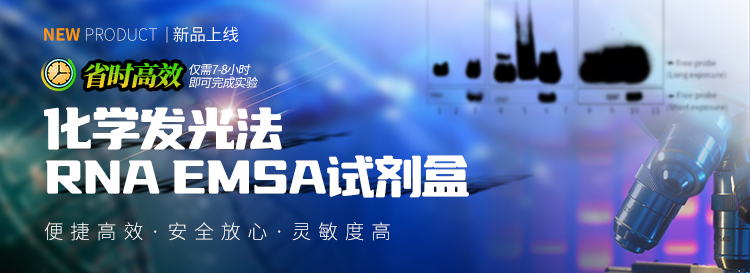 RNA与蛋白质相互作用在诸如转录、翻译和RNA后转录调控等重要的生物学过程中起着非常关键的作用,是非常重要且火热的研究方向。传统研究RNA-蛋白质相互作用的方法有:RNA pull down、RIP(RNA binding protein immunoprecipitation, RNA结合蛋白免疫沉淀)等。随着技术与应用的发展,近些年来EMSA实验也成功被应用于RNA-蛋白质相互作用的研究,碧云天新近上架的化学发光法RNA EMSA试剂盒仅需7-8小时即可完成实验,让您更快地揭秘RNA-蛋白质相互作用!快来跟小编一起了解下吧~