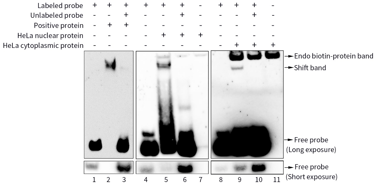 图1.碧云天化学发光法RNA EMSA试剂盒(GS606)对阳性蛋白、HeLa细胞的细胞核蛋白和细胞浆蛋白的检测效果图。