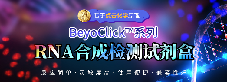 RNA的生物合成有两种方式:RNA转录和RNA复制。在生物中,大部分遗传信息都是以DNA为模板,以四种核糖核苷酸为原料,在RNA聚合酶催化下以转录形式传递的。仅有少数的RNA病毒是以RNA复制的方式传递遗传信息的。作为重要的遗传信息传递过程,RNA合成研究非常重要。近期,碧云天新上架了基于2022年诺贝尔化学奖-“点击化学”原理的BeyoClick™系列RNA合成检测试剂盒,帮您简单、快速、高灵敏地检测新合成RNA!