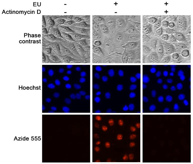 如下图,EU孵育2小时后检测,无EU组观察不到明显荧光(最左侧一列);EU (1mM)组有较强的绿色(488)/红色(555)荧光(中间一列);而用RNA合成抑制剂Actinomycin D (1μM)提前预处理0.5小时后,荧光显著减弱,说明RNA合成抑制后,EU的掺入被显著抑制(最右侧一列)。