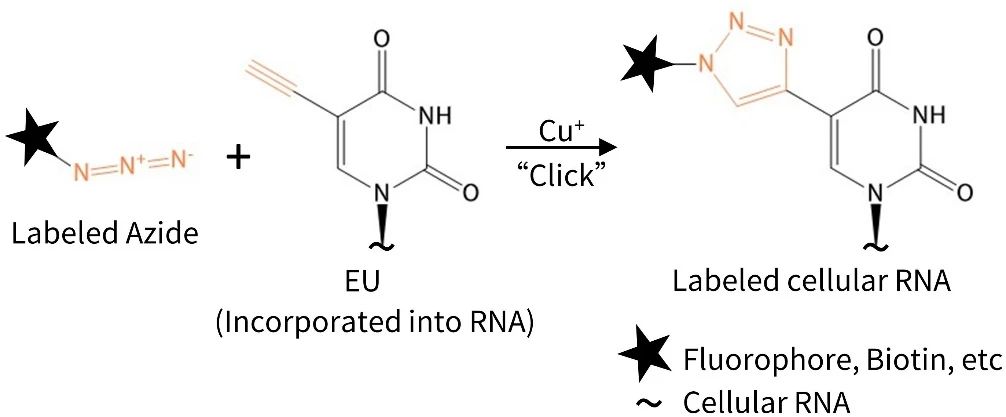 EU (5-ethynyl-uridine),中文名为5-炔基尿苷,是一种新型尿嘧啶核苷(Uridine)类似物,EU可以在RNA合成过程中替代尿苷掺入到新合成的RNA中。另一方面,EU上的乙炔基能与荧光标记的小分子叠氮化物探针(如Azide Alexa Fluor 488、Azide Alexa Fluor 555、Azide Alexa Fluor 594、Azide Alexa Fluor 647等)通过一价铜离子的催化发生共价反应,形成稳定的三唑环,该反应非常迅速高效,被称作点击反应(Click reaction),其反应原理参见图1。通过点击反应,新合成的RNA会被相应的荧光探针所标记,从而可以使用适当的荧光检测设备检测到新合成RNA。