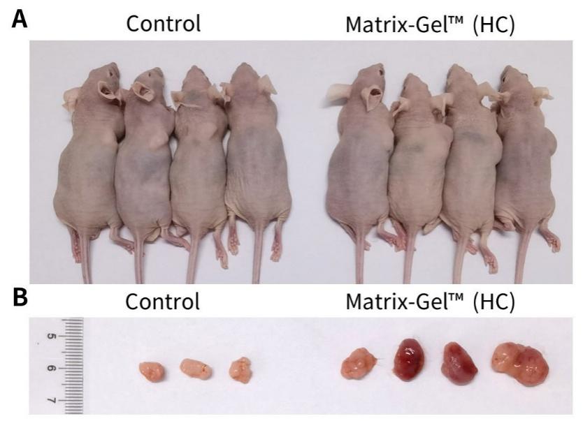图2. 碧云天Matrix-Gel™基质胶(高浓度,低生长因子) (C0386/C0387)用于免疫缺陷小鼠皮下成瘤实验的效果图。