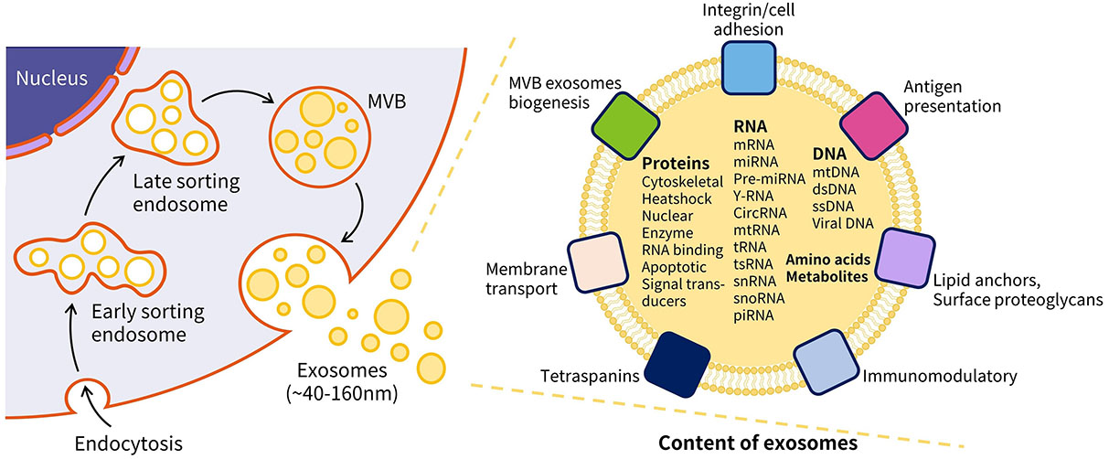 细胞膜内吞(Endocytosis)依次形成初级内体(Early sorting endosome, ESE)、次级内体(Late sorting endosome, LSE)和多囊泡体(Multivesicular body, MVB),其中多囊泡体包含腔内囊泡(Intraluminal vesicles, ILVs),而多囊泡体与细胞膜融合形成外泌体。外泌体携带多种来自其母体细胞的成分(包括核酸、蛋白质、脂类、糖类和代谢物等)释放到胞外基质中[5],如图1。