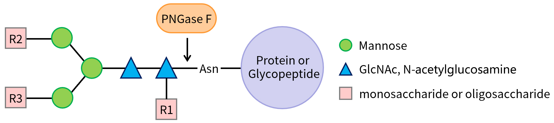 可切割几乎所有类型的N-多糖:糖基肽酶F可以在几乎所有类型的N-多糖如高甘露糖、混合型和复杂寡聚糖的最内端N-乙酰葡萄糖胺和天冬酰胺残基的连接处切割,从而去除N-聚糖链。可用于抗体、免疫球蛋白融合蛋白或其它糖蛋白的体外去除N-糖基化修饰反应;