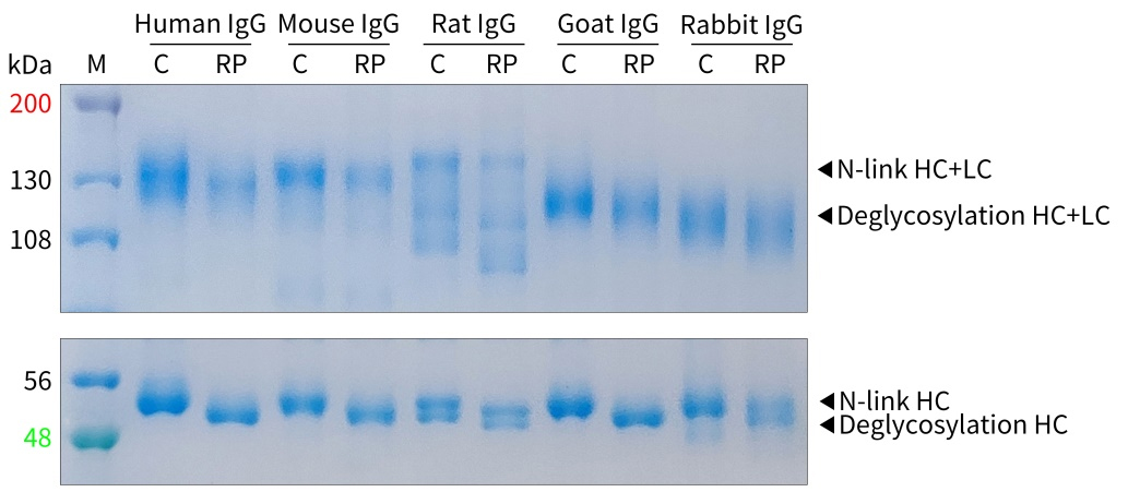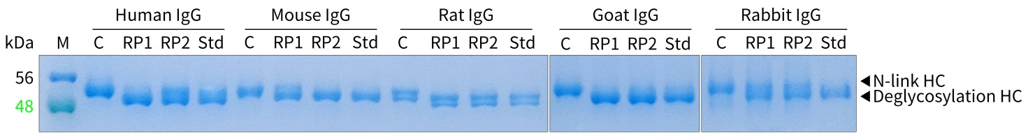 图3.Rapid PNGase F去糖基化试剂盒(非变性法) (P2543)去除不同种属IgG的N-糖基化修饰效果图。