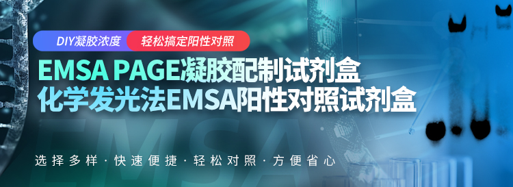 凝胶迁移实验(Electrophoretic Mobility Shift Assays, EMSA)主要基于DNA/蛋白质或RNA/蛋白质复合物在聚丙烯酰胺凝胶电泳(PAGE)中有不同迁移率的原理,是检测蛋白质与核酸相互作用重要的实验之一(详细请戳:一文搞懂EMSA实验)。近期,碧云天上架了EMSA PAGE凝胶配制试剂盒和化学发光法EMSA阳性对照试剂盒,快来跟小编了解下吧!