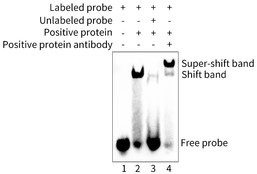 图1.碧云天化学发光法EMSA阳性对照试剂盒检测结果。1为阴性对照反应;2为阳性蛋白-探针的结合反应;3为未标记探针冷竞争反应;4为阳性蛋白抗体的Super-shift反应。