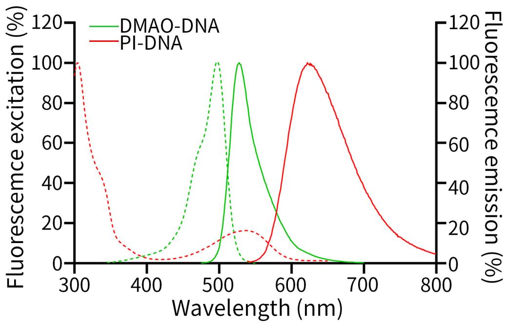 图1.DMAO-DNA和PI-DNA的激发光谱和发射光谱。