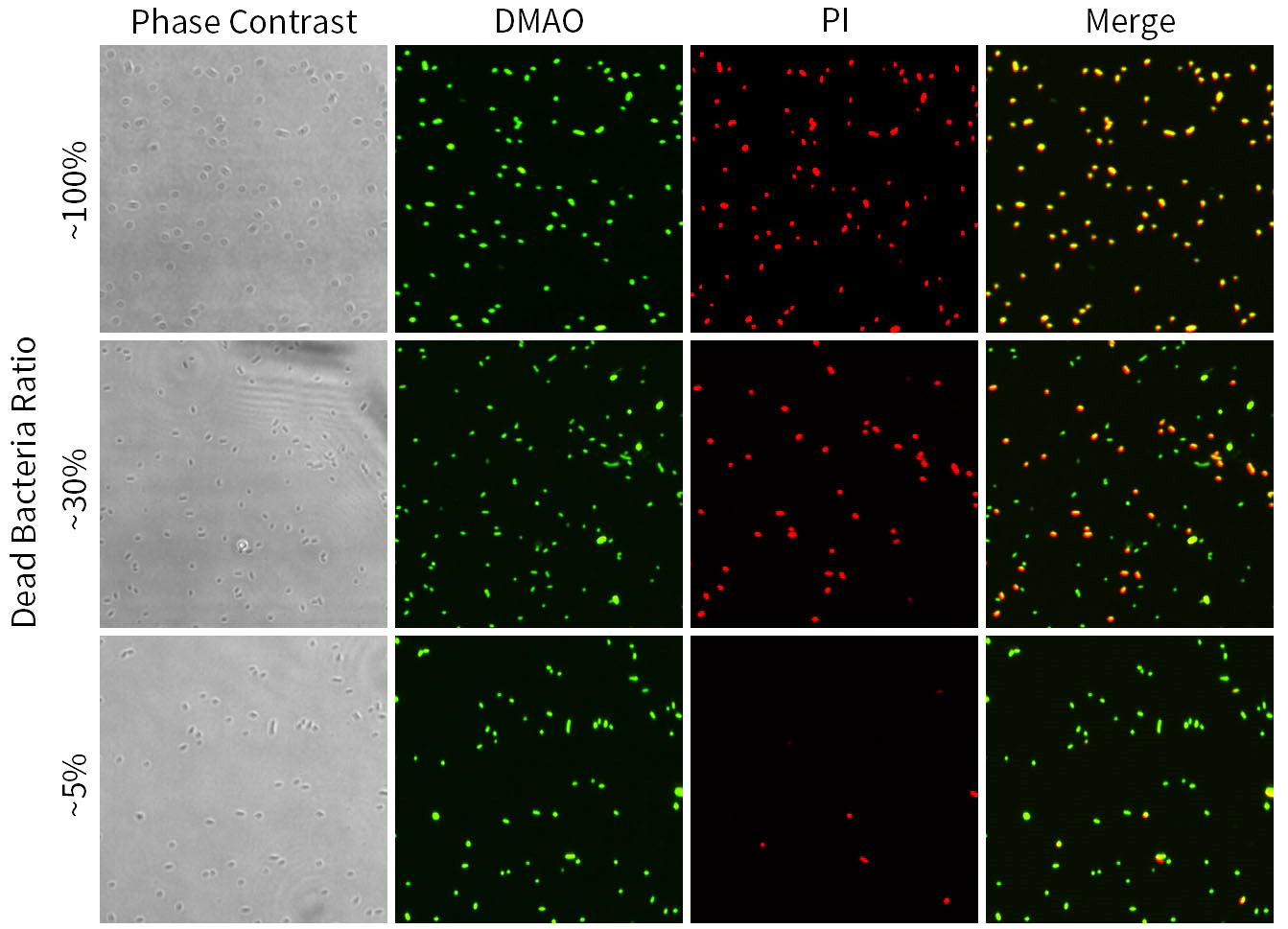 死细菌被红色和绿色两种荧光染色,荧光叠加后呈现黄色荧光