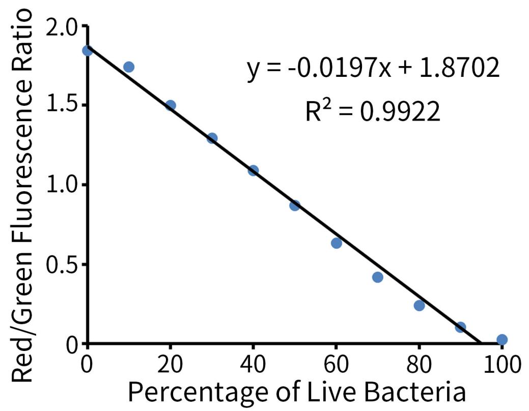 图3.碧云天细菌死活染色试剂盒(DMAO/PI) (C2030)对不同细菌死活比例DH5α菌株的检测效果,在0-100%的细菌存活率范围内有良好的线性关系。