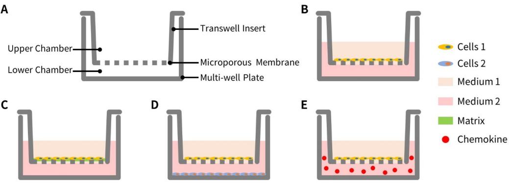 细胞小室是将一种可渗透性支架放置于多孔板中,小室内称为上室,培养孔内称为下室,可同时培养两种细胞,常用于细胞共培养实验、趋化实验、细胞迁移、侵袭或药物转运等研究。细胞小室的底部是一张具有通透性的膜,具有一定的孔径和孔密度,通常细胞共培养实验采用0.4μm孔径膜,趋化实验、细胞迁移和侵袭实验需要选择3、5或8μm孔径膜。