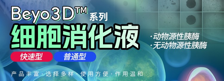 | 产品名称 | Beyo3D™胰酶 细胞消化液 | Beyo3D™快速 胰酶细胞消化液 | Beyo3D™ BeyoTryp™ Express Enzyme (AOF) | Beyo3D™ BeyoTryp™ Express Enzyme (Quick, AOF) |