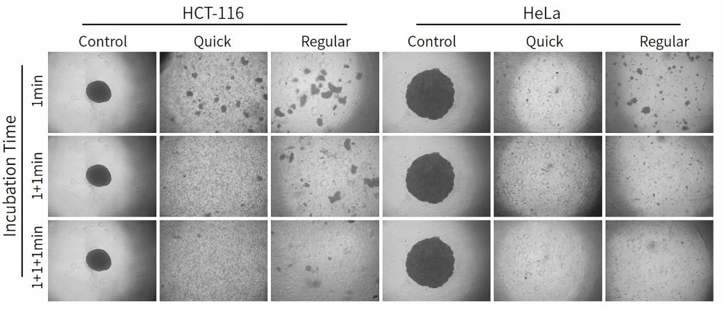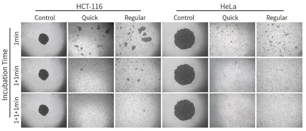 图1. 碧云天Beyo3D™胰酶细胞消化液(C1321)和Beyo3D™快速胰酶细胞消化液(C1323)对HCT-116和HeLa 3D细胞球的消化效果对比图。