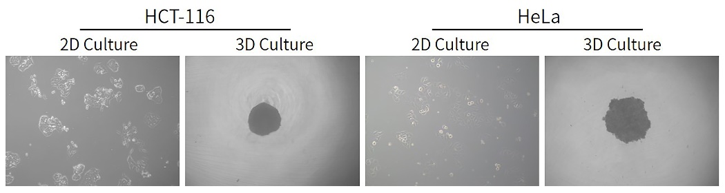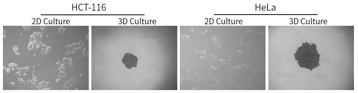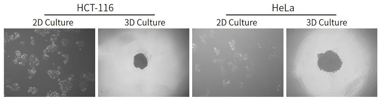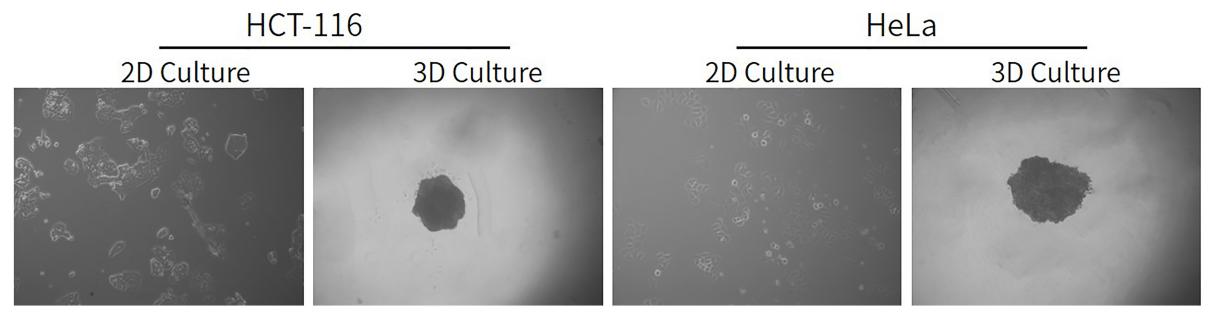 图6. 碧云天Beyo3D™ BeyoTryp™ Express Enzyme (Quick, AOF) (C1328)消化后的HCT-116和HeLa 3D细胞球进一步进行2D和3D培养48小时后的细胞的生长效果图。