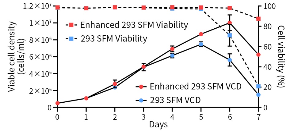 293细胞是实验室常用的细胞系,具有转染效率高、生长速度快、易于培养等特点,广泛用于生产蛋白及抗体、大规模药物生产、制备疫苗等多个领域。而293细胞常用含血清的培养液进行贴壁培养,但病毒包装或重组蛋白生产过程中外源性蛋白质和血清的存在不仅会成为实验和数据分析中的混杂因素,影响重复性,还可能干扰下游纯化、影响产物质量。