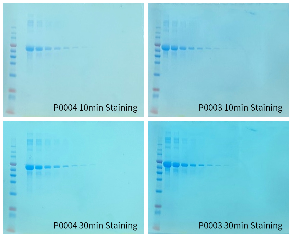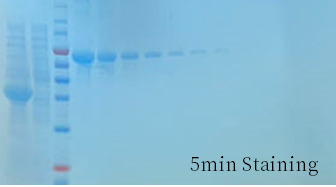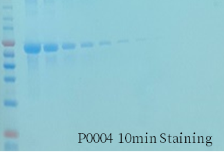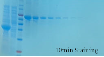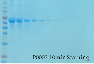 BeyoBlue™ Plus考马斯亮蓝超快染色液(特快)染色5分钟肉眼即可观察到10ng蛋白条带,染色10分钟肉眼即可观察到5ng的蛋白条带。