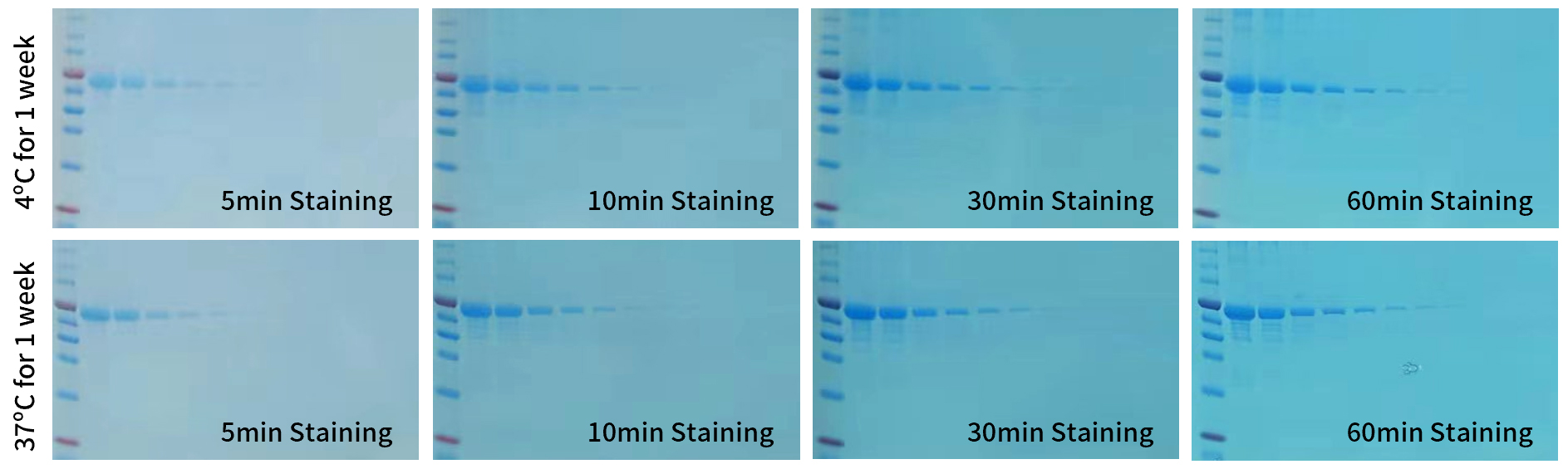 稳定性好:BeyoBlue™ Plus考马斯亮蓝超快染色液(特快)(P0003)、BeyoBlue™ Plus考马斯亮蓝超快染色液(低背景)(P0004)在37℃水浴放置1周后染色效果无显著变化;