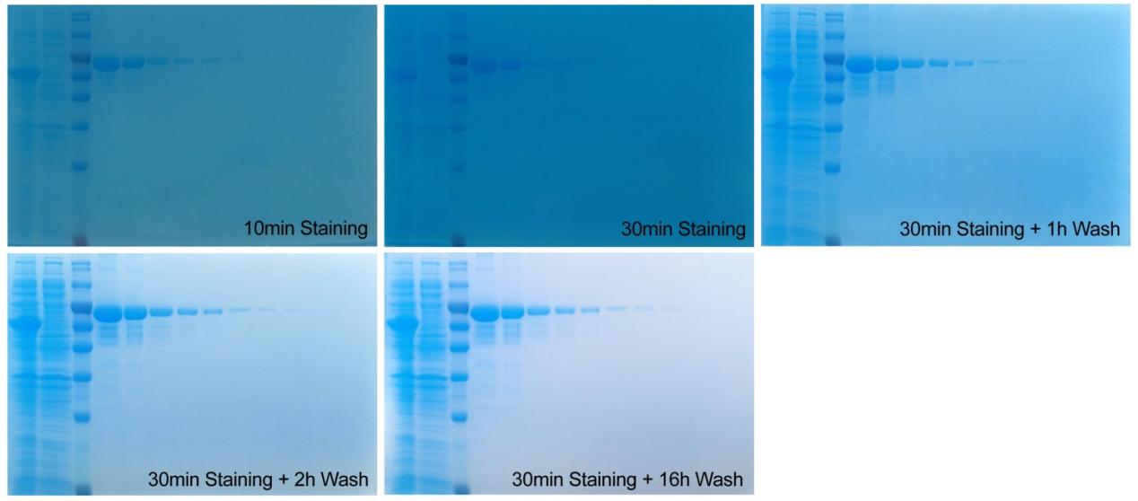 无需固定、无需煮沸,可不脱色或用水脱色,操作便捷:无需对蛋白凝胶进行固定,无需进行煮沸以加快洗涤、染色或脱色,不脱色即可观察到清晰的蛋白条带,用水即可进行脱色以获得无色透明的背景,操作非常便捷;