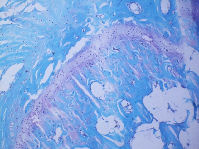 番红O(Safranine O)是一种阳离子染料,可与软骨蛋白多糖中阴离子基团(硫酸软骨素或硫酸角质素)结合呈现红色、紫红色或紫色以显示软骨。当软骨受到损伤时,软骨中的糖蛋白会释放出来,使基质成分分布不均匀,从而导致番红O淡染或不着色;