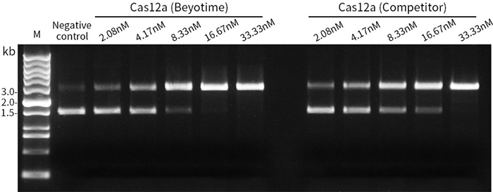 碧云天生产的FnCas12a (Cpf1) (D0510)和N公司的Cas12a酶活性检测对比效果图。
