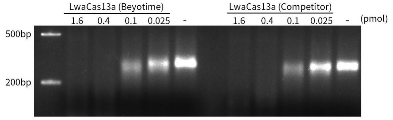 碧云天LwaCas13a (D0517)和G公司的LwaCas13a酶活性检测对比效果图。