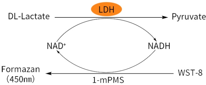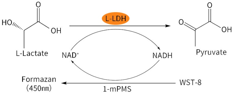 乳酸脱氢酶将乳酸催化氧化生成丙酮酸,这一过程中,NAD+还原为NADH,生成的NADH在电子耦合试剂1-mPMS的作用下将WST-8还原成橙黄色的甲瓒,在450nm左右有最大吸收峰。催化生成甲瓒的量与乳酸的含量以及相应脱氢酶的活性呈正比,通过测定450nm处的吸光值可以非常灵敏地检测样品中相关指标的含量/活性,产品原理图如下: