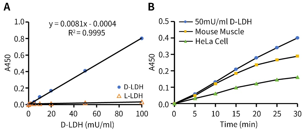 D-乳酸脱氢酶(P0392)的检测活力低至0.5mU/ml,线性范围为0.5-100mU/ml;