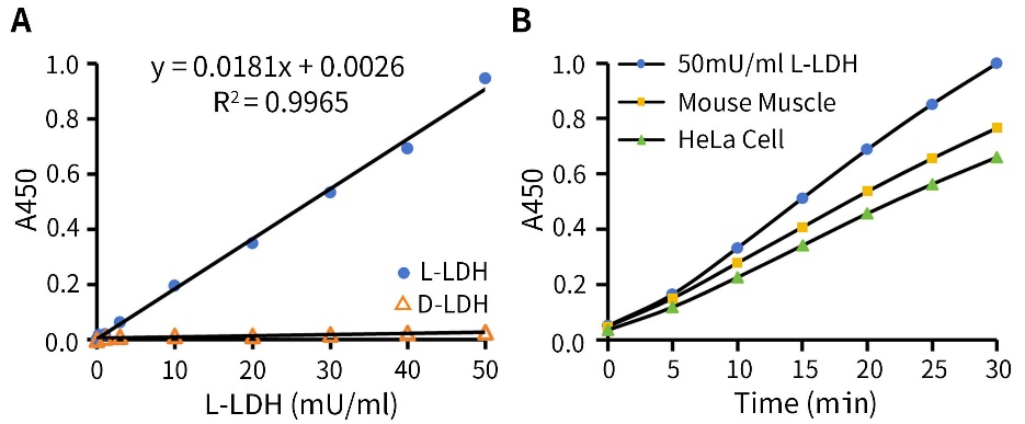 L-乳酸脱氢酶(P0393)的检测活力低至0.3mU/ml,线性范围为0.3-50mU/ml;