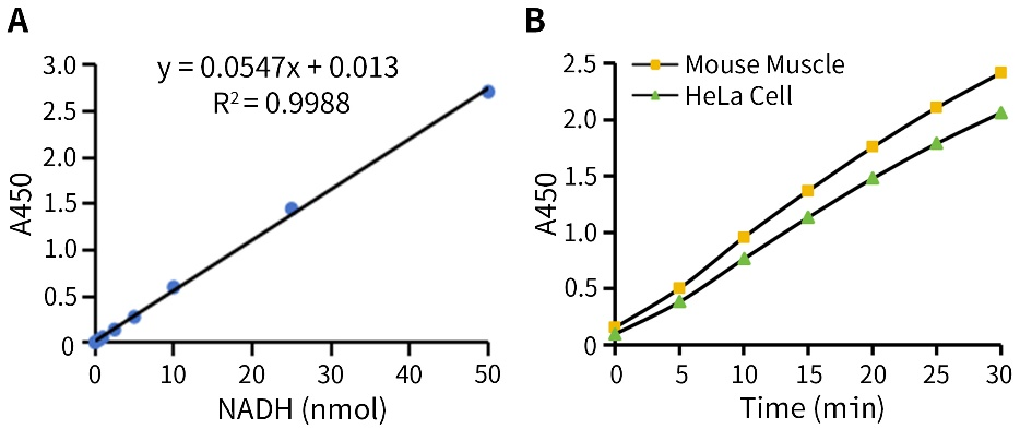 图5.碧云天总乳酸脱氢酶检测试剂盒(WST-8法)(P0395)对NADH标准品、小鼠肌肉以及HeLa细胞样品的检测效果图。