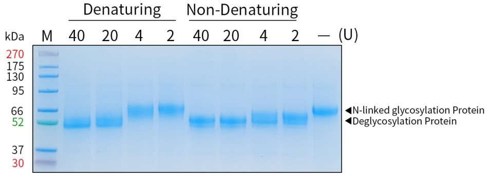 可切割几乎所有类型的N-多糖:糖基肽酶F可以在几乎所有类型的N-多糖如高甘露糖、混合型和复杂寡聚糖的最内端N-乙酰葡萄糖胺和天冬酰胺残基的连接处切割,从而去除N-聚糖链。可用于抗体、免疫球蛋白融合蛋白或其它糖蛋白的体外去除N-糖基化修饰反应;
