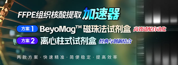 福尔马林固定石蜡包埋组织(FFPE)是一种宝贵的样本来源,但要从中提取高质量的基因组DNA或者RNA却是一项充满挑战的工作。针对科研工作者在FFPE组织核酸提取中的痛点,碧云天生物推出两款针对性解决方案:BeyoMag™磁珠法试剂盒与离心柱式试剂盒。无论你的需求偏向批量高效还是小量高质,这两种工具都能为你的科研提速!