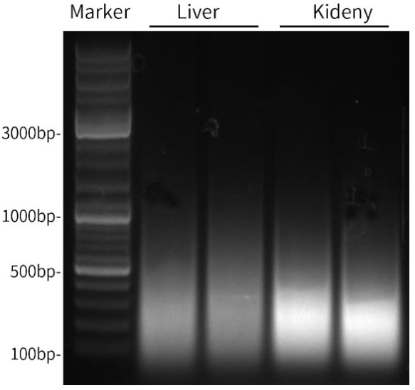 图1. 碧云天BeyoMag™石蜡包埋组织基因组DNA抽提试剂盒(磁珠法) (D0089)的DNA抽提效果图。