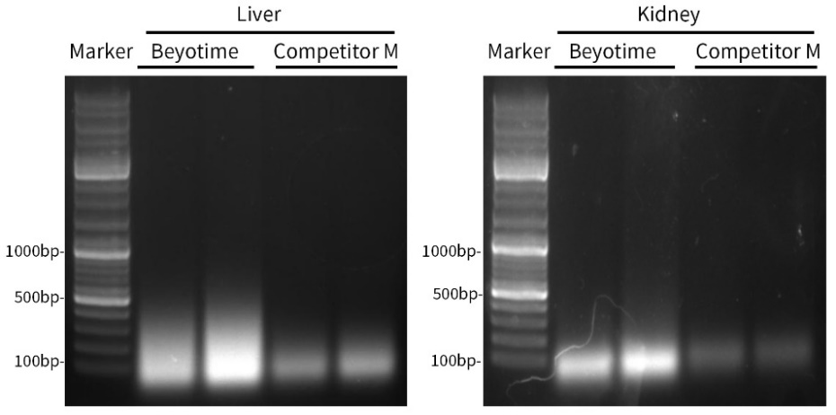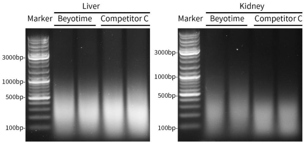 图4.碧云天RNAeasy™石蜡包埋组织RNA抽提试剂盒(离心柱式) (R0033)与同类产品(Competitor C)的RNA抽提效果对比图。