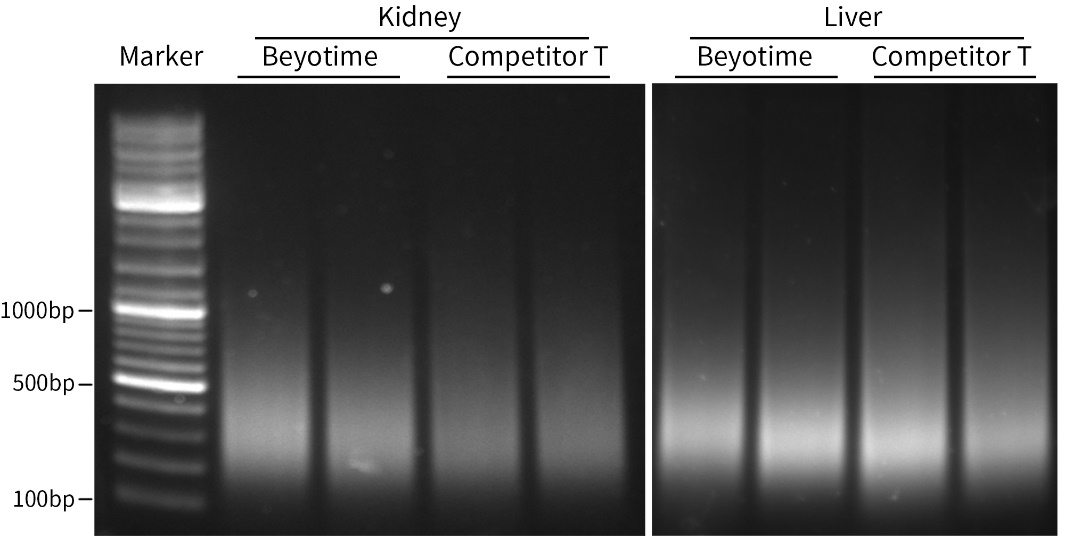 图3.碧云天石蜡包埋组织基因组DNA抽提试剂盒(离心柱式) (D0064)与T品牌同类产品(Competitor T)的DNA抽提效果对比图。