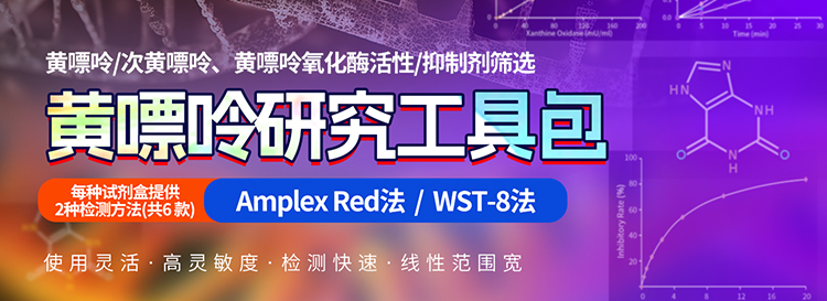 碧云天最新上线黄嘌呤研究工具包,包含黄嘌呤/次黄嘌呤检测试剂盒、黄嘌呤氧化酶活性检测试剂盒及抑制剂筛选试剂盒,每种试剂盒均提供Amplex Red法和WST-8法两种检测方法,共六款试剂盒。检测试剂盒仅需0.1-2μl血样就足够用于检测,抑制剂筛选试剂盒不仅提供检测所需的各种试剂,还提供阳性对照非布司他(Febuxostat),使用方便。