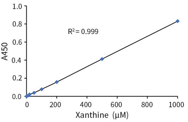 图2. 碧云天黄嘌呤/次黄嘌呤检测试剂盒(WST-8法)(S0114)检测黄嘌呤标准曲线的效果图。