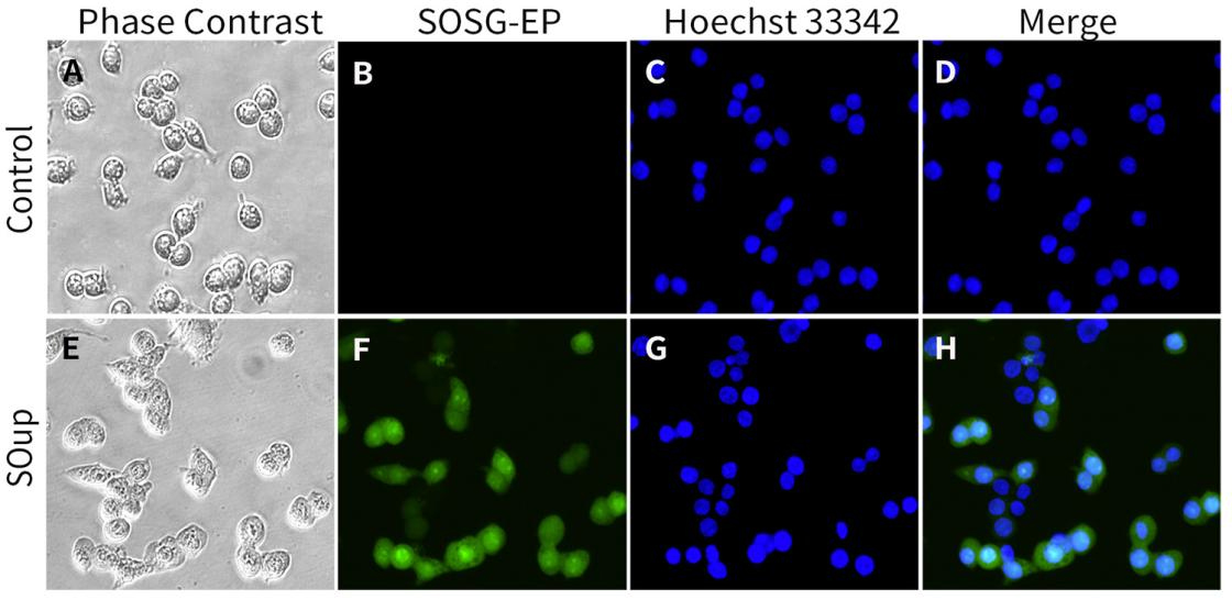碧云天单线态氧检测试剂盒(SOSG) (S0068)检测RAW264.7 (小鼠单核巨噬细胞)细胞内单线态氧的效果图: