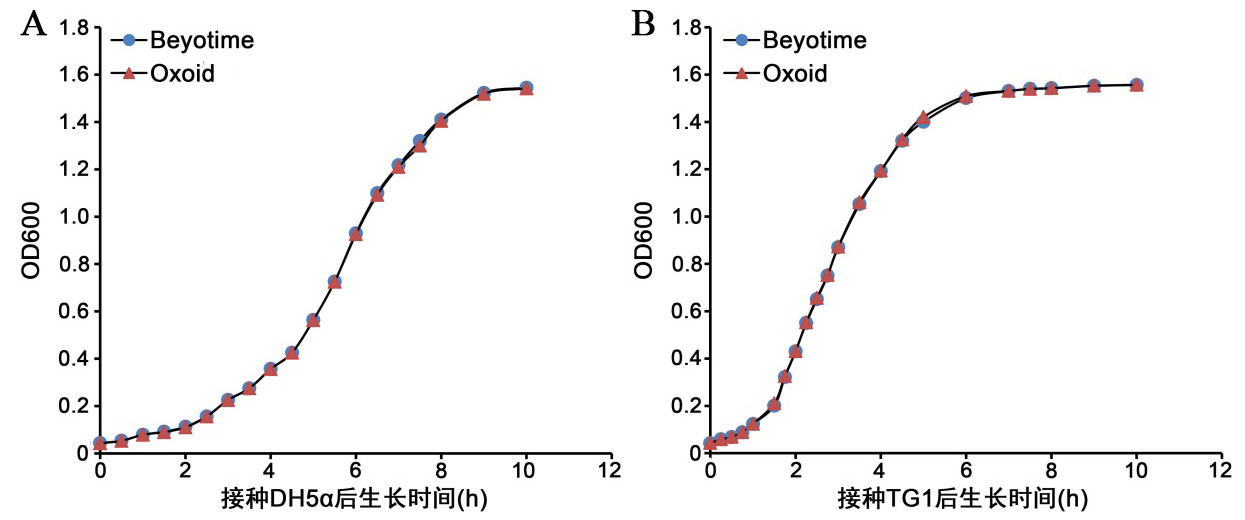 图1. 碧云天的BeyoPure™ LB Broth (premixed powder)配制的LB培养基与用国外Oxoid的胰蛋白胨和酵母膏配制的LB用于细菌培养的效果图。上图为大肠杆菌DH5α(A)和TG1(B)在碧云天和Oxoid产品配制的LB培养基中的生长曲线比较。
