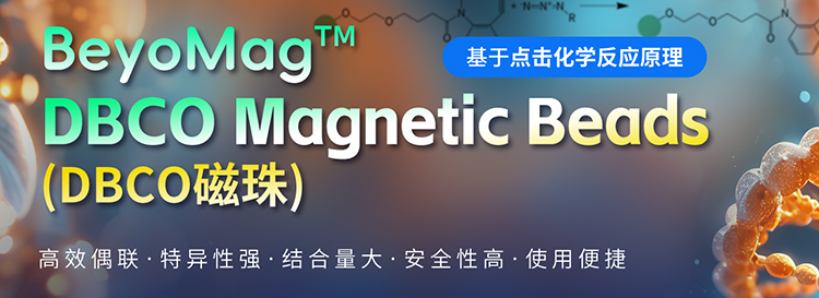BeyoMag™ DBCO Magnetic Beads(DBCO磁珠)(ST433)是一种基于点击化学反应原理的新型生物偶联工具。该产品通过将二苯并环辛炔(DBCO)基团与超顺磁性纳米级磁珠共价偶联而成,能够在温和条件下快速、高效地与叠氮化物标记(Azide-tagged)的生物分子发生反应以进行标记、追踪、纯化或分离,可以用于蛋白-蛋白、蛋白-生物分子、DNA-蛋白的相互作用研究等,是医学和生命学研究中的重要工具。
