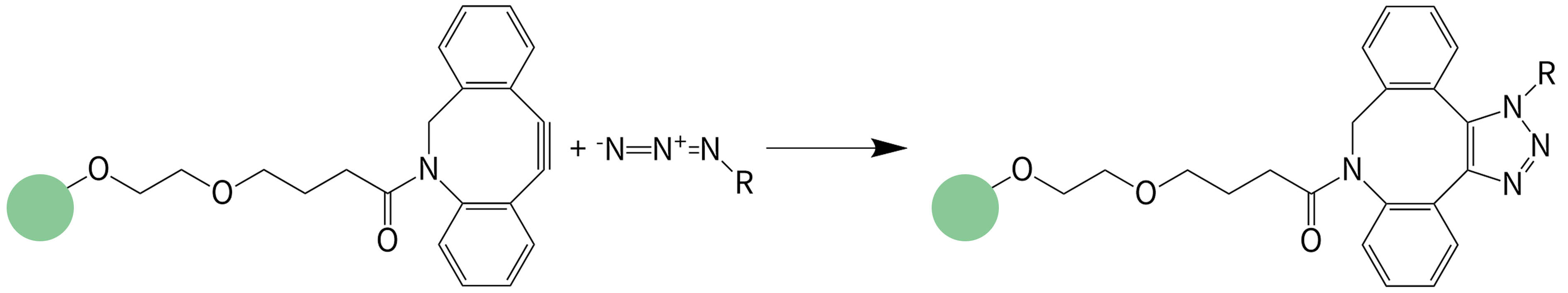 高效偶联:DBCO磁珠与Azide-tagged生物分子的反应无需催化剂,反应条件温和,可在生物体系中自发进行,形成稳定的三唑环结构;
