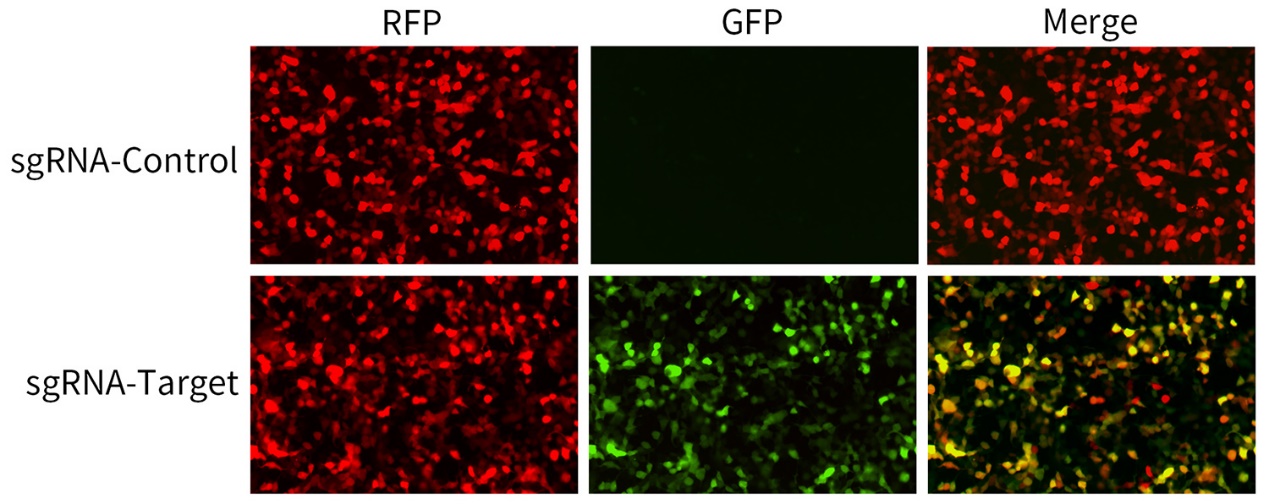 图1.碧云天BeyoCRISPR™基因编辑Surrogate GFP Reporter构建试剂盒(D8403)构建的替身报告质粒的基因编辑示踪效果图。仅在转染靶向sgRNA质粒的细胞中同时观察到RFP及GFP荧光信号,GFP荧光信号的产生来自发生基因编辑的细胞。