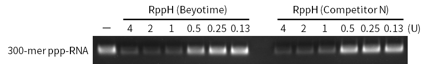 图1. 碧云天RNA 5' Pyrophosphohydrolase (RppH) (R7035)与国外N公司(Competitor N)的RppH对5'端三磷酸化RNA 5'端无机焦磷酸的水解效果对比图。碧云天的RppH与N公司的产品相比,对5'端三磷酸化RNA 5'端无机焦磷酸具有基本一致的水解效果。