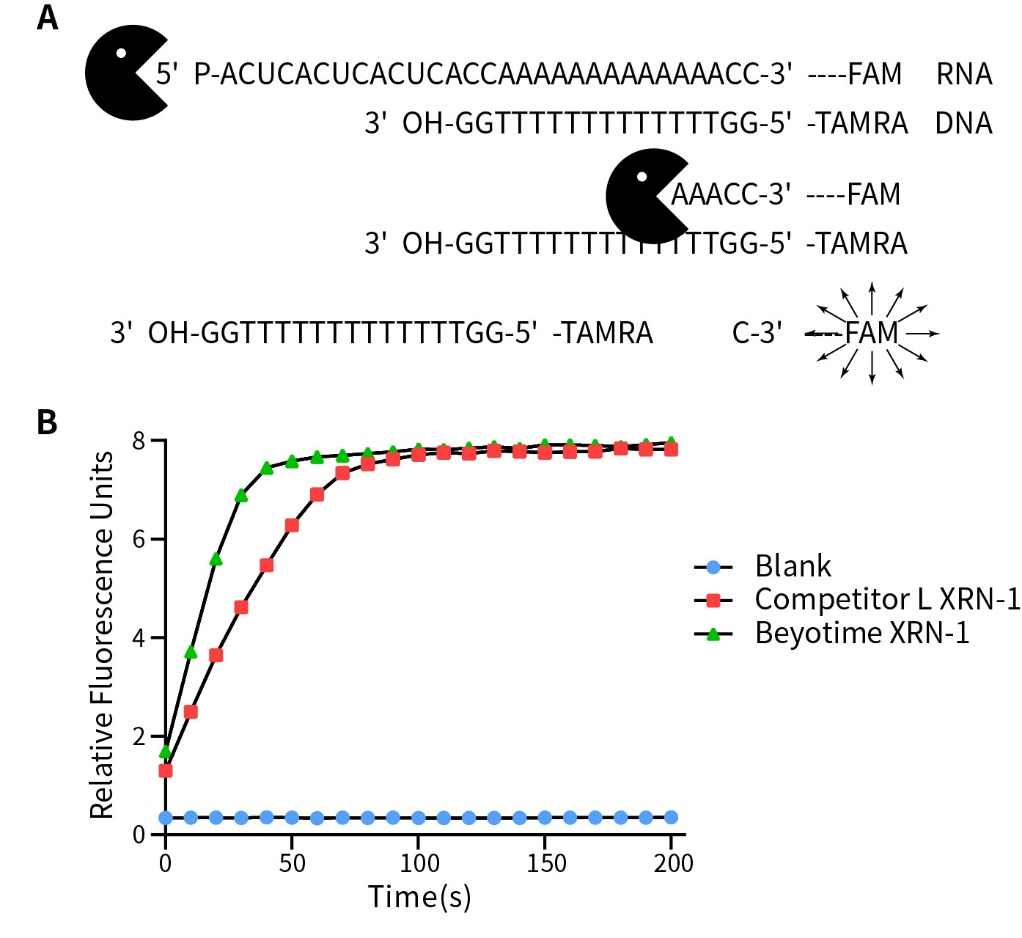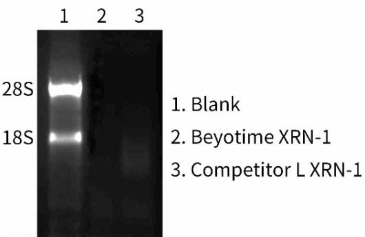 图1. 碧云天XRN-1 (R7040)与国外L公司(Competitor L)的XRN-1对5'端单磷酸化RNA水解效果对比图。碧云天与L公司的XRN-1相比,对5’端单磷酸化RNA的水解效果更优。