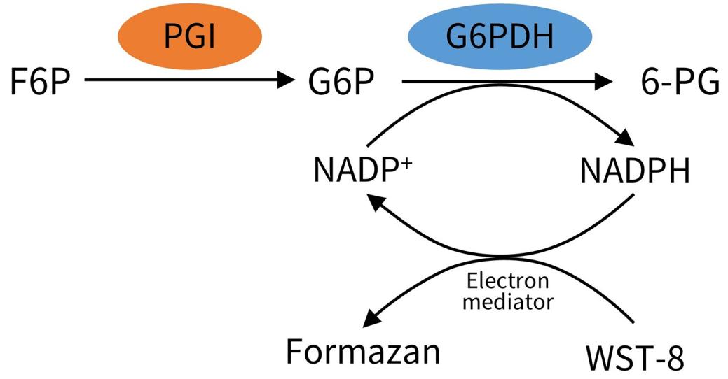 果糖-6-磷酸(F6P)被磷酸葡萄糖异构酶(PGI)异构化为葡萄糖-6-磷酸(G6P),生成的葡萄糖-6-磷酸在葡萄糖-6-磷酸脱氢酶(G6PDH)的作用下氧化生成6-磷酸葡萄糖酸内酯( 6-PG),在这一反应过程中NADP+被还原为NADPH;生成的NADPH在电子耦合试剂(Electron mediator)的作用下将WST-8还原生成橙黄色的Formazan,在450nm左右有最大吸收峰。反应体系中生成的Formazan与样品中F6P的含量成正比,由此可检测样品中F6P的含量,也可以依据此原理检测样品中PGI的含量。