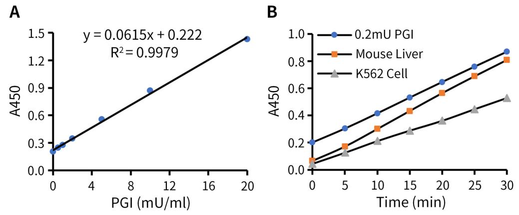 图2.碧云天磷酸葡萄糖异构酶活性检测试剂盒(WST-8法) (S0187)对磷酸葡萄糖异构酶标准品、小鼠肝脏及K562细胞(人慢性髓系白血病细胞)样品的检测效果图。