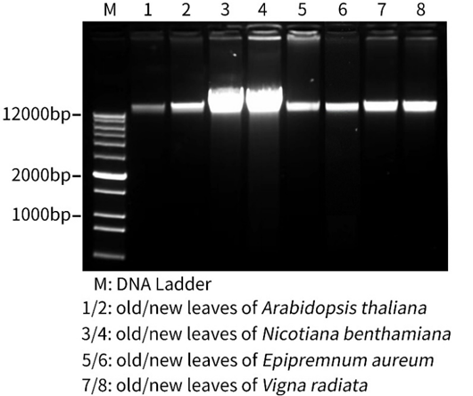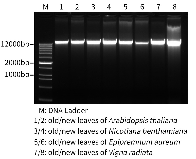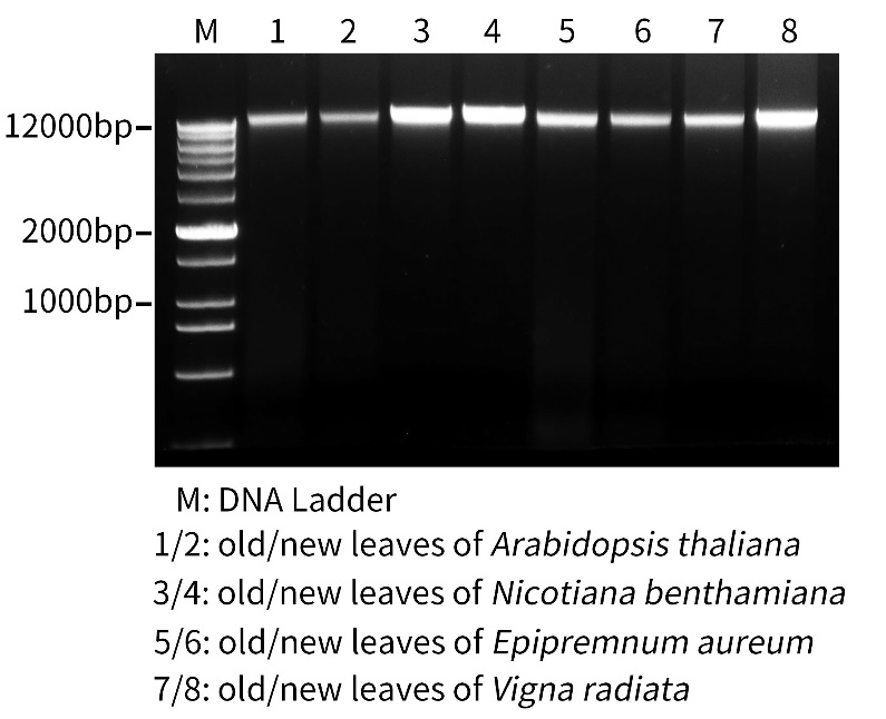 图5. 碧云天BeyoMag™植物基因组DNA小量抽提试剂盒(磁珠法) (D0047)提取不同植物新老叶片的基因组DNA效果
